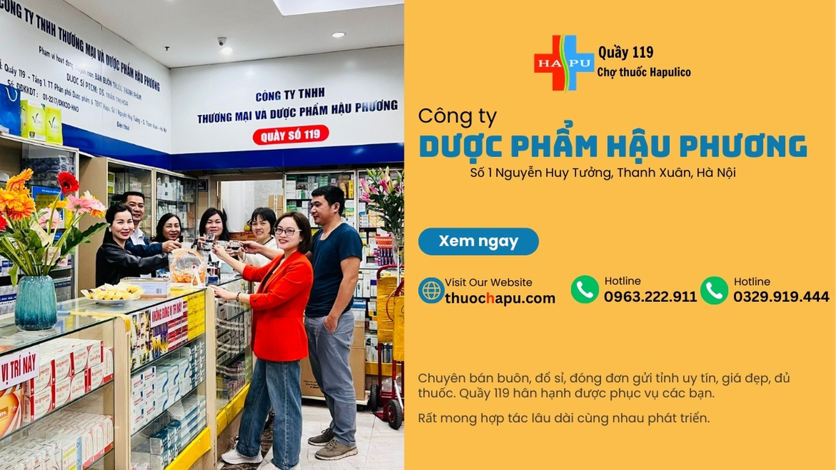 Công ty Dược phẩm Hậu Phương – Quầy 119 chợ thuốc Hapulico, nhà cung cấp dược phẩm uy tín tại Hà Nội, chuyên phân phối thuốc, thực phẩm chức năng, mỹ phẩm và thiết bị y tế chính hãng với giá sỉ cạnh tranh. Nằm trong trung tâm dược phẩm Hapulico – đầu mối thuốc lớn nhất miền Bắc, Hậu Phương Pharma mang đến cho khách hàng nguồn hàng ổn định, chất lượng, và dịch vụ tư vấn chuyên nghiệp. Với phương châm “Chất lượng – Uy tín – Hợp tác bền lâu”, chúng tôi luôn nỗ lực trở thành đối tác tin cậy của các nhà thuốc, đại lý dược và công ty phân phối trên toàn quốc.